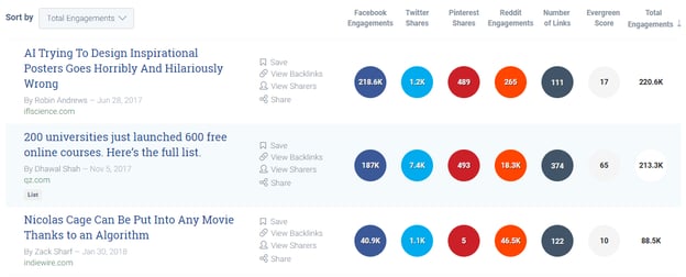 From here, you can see not only what the trending topics are, but also where they’re being shared. Whether it’s Facebook, Twitter, Pinterest, or Reddit. This can help you get an idea of where to promote your own similar content to maximize your engagements.