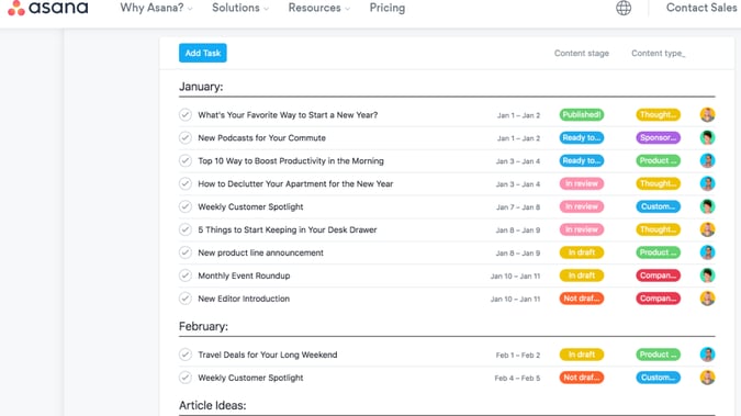Now, you could just use a physical calendar hanging in your office and call it a day. Or, you could get with the times and use a digital content calendar. Something like Asana works great in planning your content creation and setting due dates.