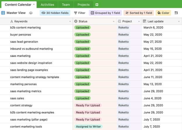 Again, there are many tools out there that will get the job done - it’s all about finding the one that works the best for you. Here at Roketto we use AirTable for managing all of our content calendars, topics, and even our team members.