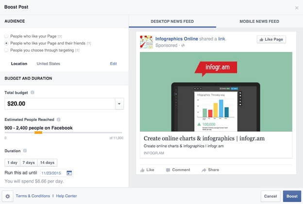 But be careful, diving straight into paid ads before you have an organic audience can be a trap you don’t want to fall into, and can deplete your budget before you can make any progress. Try to dedicate a modest budget to boosting each post. In most cases, $5-$10 can lead to a ton of exposure for your post if done right.