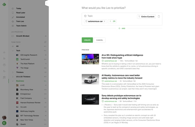 Leo has been asked to prioritize articles about autonomous cars. Boom. A list of articles across several saved databases all pertaining to autonomous cars.